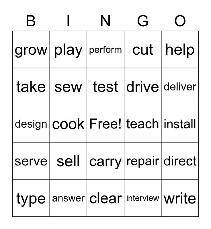 This bingo card has a free space and 24 words: sell, answer, test, type, help, grow, take, play, teach, carry, drive, design, repair, direct, sew, interview, install, perform, deliver, cook, write, serve, cut and clear.