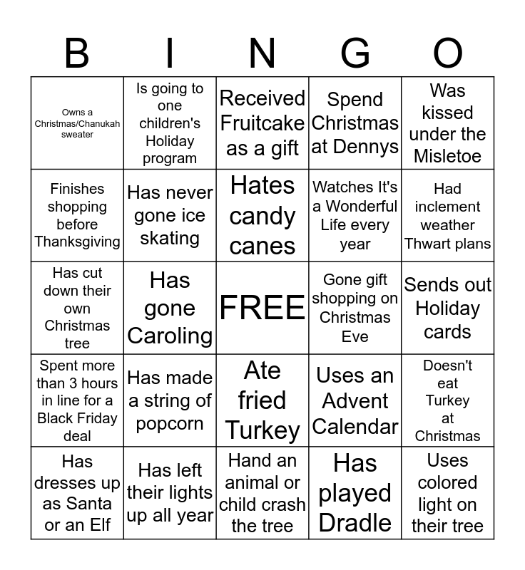 This bingo card has a free space and 24 words: Has made a string of popcorn, Has left their lights up all year, Hates candy canes, Has dresses up as Santa or an Elf, Was kissed under the Misletoe, Owns a Christmas/Chanukah sweater, Finishes shopping before Thanksgiving, Is going to one children's Holiday program, Gone gift shopping on Christmas Eve, Ate fried Turkey, Watches It's a Wonderful Life every year, Has cut down their own Christmas tree, Uses an Advent Calendar, Doesn't eat Turkey at Christmas, Has never gone ice skating, Has played Dradle, Sends out Holiday cards, Received Fruitcake as a gift, Had inclement weather Thwart plans, Has gone Caroling, Uses colored light on their tree, Spent more than 3 hours in line for a Black Friday deal, Spend Christmas at Dennys and Hand an animal or child crash the tree.