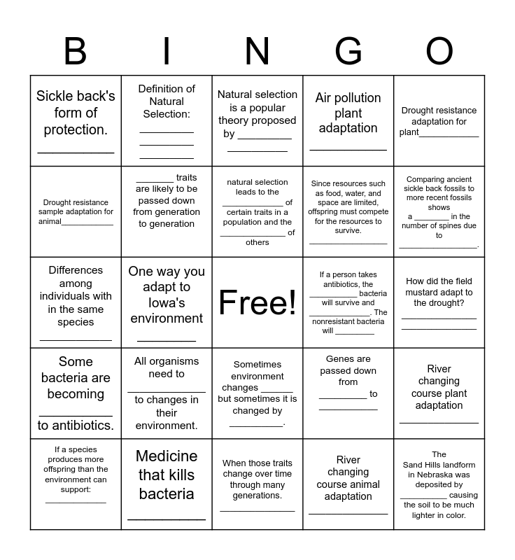 This bingo card has a free space and 24 words: All organisms need to _____________ to changes in their environment., Medicine that kills bacteria _________, natural selection leads to the _____________ of certain traits in a population and the ______________ of others, If a species produces more offspring than the environment can support: _____________, Drought resistance adaptation for plant____________, Sickle back's form of protection. __________, Drought resistance sample adaptation for animal____________, Definition of Natural Selection: _________ _________ _________, If a person takes antibiotics, the ___________ bacteria will survive and ______________. The nonresistant bacteria will _________, Sometimes environment changes ______ but sometimes it is changed by __________., Since resources such as food, water, and space are limited, offspring must compete for the resources to survive. __________________, Differences among individuals with in the same species ____________, Genes are passed down from _________ to ___________, River changing course plant adaptation ______________, _______ traits are likely to be passed down from generation to generation, River changing course animal adaptation ______________, How did the field mustard adapt to the drought? _______________ _______________, Natural selection is a popular theory proposed by _________ __________, Comparing ancient sickle back fossils to more recent fossils shows a ________ in the number of spines due to __________________., One way you adapt to Iowa's environment ________, The Sand Hills landform in Nebraska was deposited by __________ causing the soil to be much lighter in color., Some bacteria are becoming __________ to antibiotics., Air pollution plant adaptation ___________ and When those traits change over time through many generations. _______________.