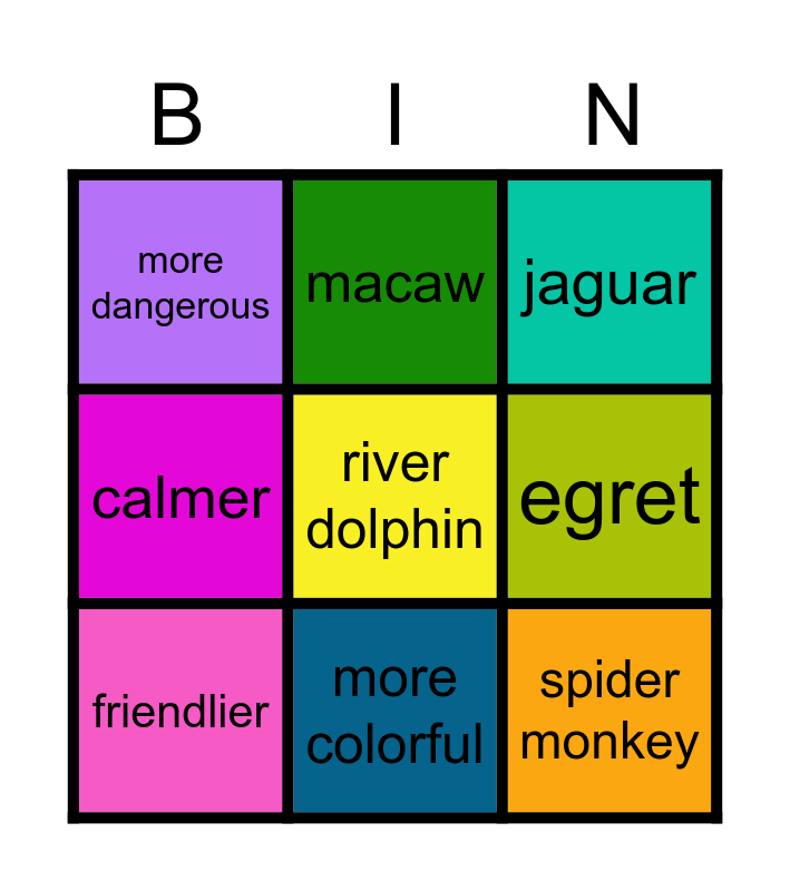 This bingo card has 12 words: sloth, spider monkey, river dolphin, egret, macaw, jaguar, more colorful, plainer, more dangerous, calmer, friendlier and more energetic.