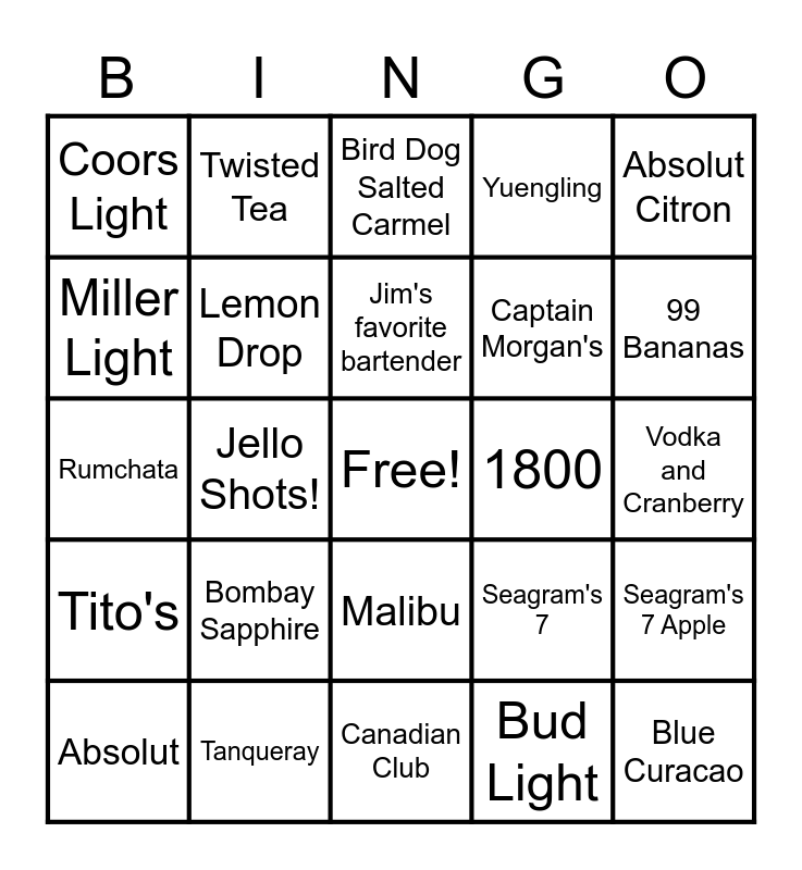This bingo card has a free space and 24 words: Bombay Sapphire, Tanqueray, Jim's favorite bartender, Absolut, Absolut Citron, Coors Light, Miller Light, Twisted Tea, 1800, Malibu, Captain Morgan's, Rumchata, Seagram's 7, Seagram's 7 Apple, Lemon Drop, Bud Light, Vodka and Cranberry, Bird Dog Salted Carmel, 99 Bananas, Jello Shots!, Blue Curacao, Tito's, Yuengling and Canadian Club.