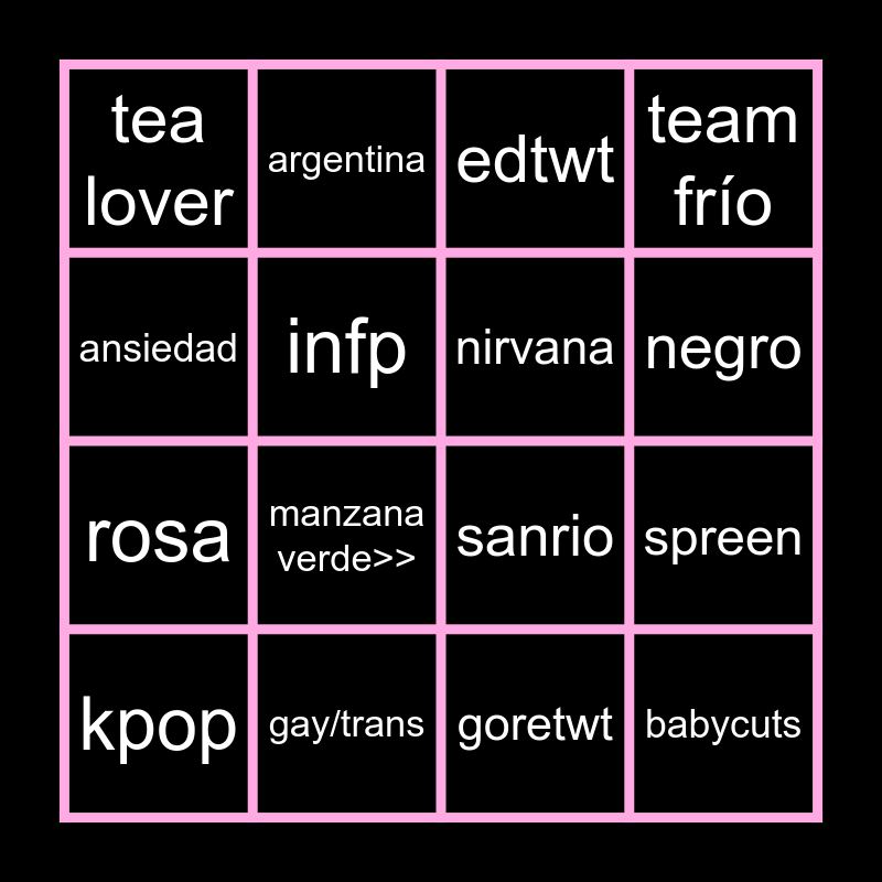 This bingo card has 16 words: gay/trans, spreen, edtwt, tea lover, rosa, argentina, sanrio, goretwt, ansiedad, infp, kpop, team frío, manzana verde>>, negro, nirvana and babycuts.