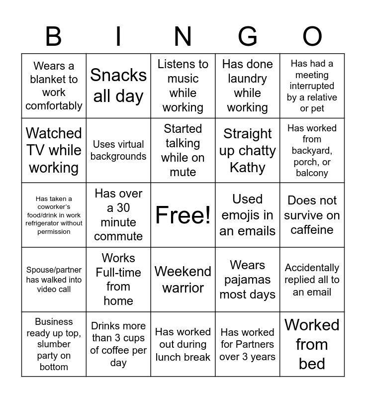 This bingo card has a free space and 24 words: Works Full-time from home, Drinks more than 3 cups of coffee per day, Started talking while on mute, Business ready up top, slumber party on bottom, Has had a meeting interrupted by a relative or pet, Wears a blanket to work comfortably, Watched TV while working, Snacks all day, Used emojis in an emails, Weekend warrior, Straight up chatty Kathy, Has taken a coworker’s food/drink in work refrigerator without permission, Wears pajamas most days, Accidentally replied all to an email, Uses virtual backgrounds, Has worked for Partners over 3 years, Does not survive on caffeine, Listens to music while working, Has worked from backyard, porch, or balcony, Has over a 30 minute commute, Worked from bed, Spouse/partner has walked into video call, Has done laundry while working and Has worked out during lunch break.
