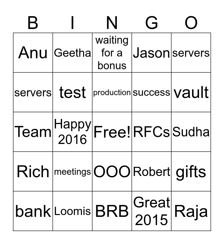 This bingo card has a free space and 24 words: meetings, Loomis, production, bank, servers, Anu, servers, Geetha, RFCs, OOO, success, Team, Robert, gifts, test, Great 2015, Sudha, waiting for a bonus, vault, Happy 2016, Raja, Rich, Jason and BRB.