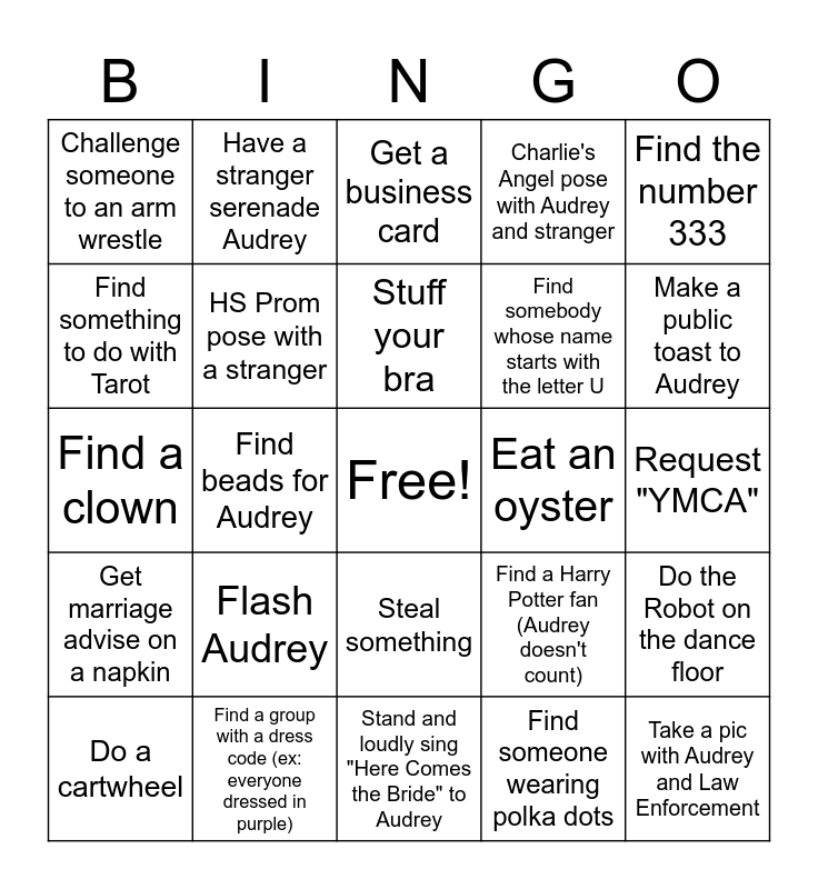 This bingo card has a free space and 24 words: Flash Audrey, Find a group with a dress code (ex: everyone dressed in purple), Stuff your bra, Do a cartwheel, Find the number 333, Challenge someone to an arm wrestle, Find something to do with Tarot, Have a stranger serenade Audrey, Eat an oyster, Steal something, Find somebody whose name starts with the letter U, Find a clown, Find a Harry Potter fan (Audrey doesn't count), Do the Robot on the dance floor, HS Prom pose with a stranger, Find someone wearing polka dots, Request "YMCA", Get a business card, Make a public toast to Audrey, Find beads for Audrey, Take a pic with Audrey and Law Enforcement, Get marriage advise on a napkin, Charlie's Angel pose with Audrey and stranger and Stand and loudly sing "Here Comes the Bride" to Audrey.