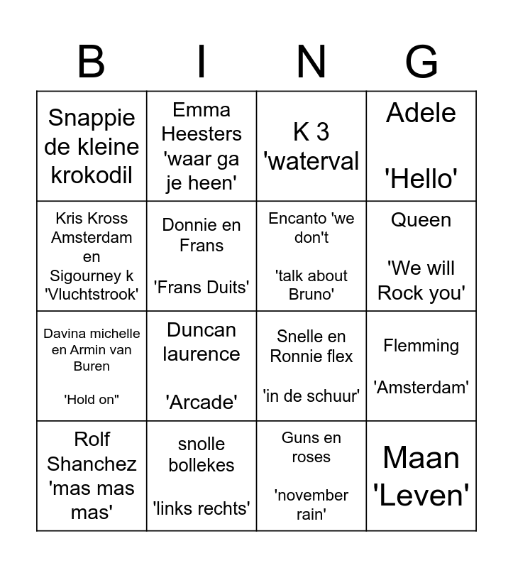 This bingo card has 20 words: Flemming 'Amsterdam', Suzan en Freek 'Dromen in kleur', K 3 'waterval, Shawn mendes met camilla cabello 'Senorita', Rolf Shanchez 'mas mas mas', Kris Kross Amsterdam en Sigourney k 'Vluchtstrook', snolle bollekes 'links rechts', Snappie de kleine krokodil, Davina michelle en Armin van Buren 'Hold on", Emma Heesters 'waar ga je heen', Duncan laurence 'Arcade', Snelle en Ronnie flex 'in de schuur', Donnie en Frans 'Frans Duits', Maan 'Leven', Encanto 'we don't 'talk about Bruno', Nielson 'ijskoud', Queen 'We will Rock you', Adele 'Hello', Guns en roses 'november rain' and Gold play 'Yellow.
