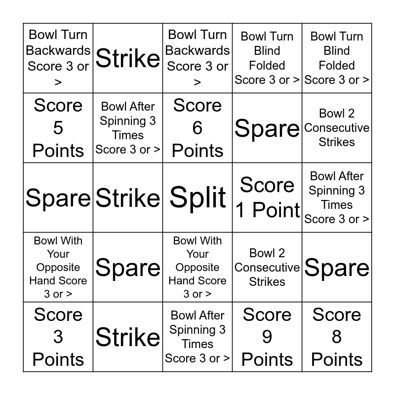 ⚠ This card has duplicate items: Spare (4), Strike (3), Bowl Turn Blind Folded Score 3 or > (2), Bowl Turn Backwards Score 3 or > (2), Bowl 2 Consecutive Strikes (2), Bowl After Spinning 3 Times Score 3 or > (3)