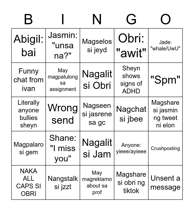 This bingo card has a free space and 24 words: Shane: "I miss you", Nangstalk si jzzt, Nagalit si Obri, NAKA ALL CAPS SI OBRI, Jade: "whale/UwU", Abigil: bai, Funny chat from ivan, Jasmin: "unsa na?", Nagchat si jbee, Nagalit si Jam, Sheyn shows signs of ADHD, Literally anyone bullies sheyn, Anyone: yieee/ayieee, Crushposting, May magpatulong sa assignment, Magshare si obri ng tiktok, Magshare si jasmin ng tweet ni elon, Magselos si jeyd, "Spm", Wrong send, Unsent a message, Magpalaro si gem, Obri: "awit" and May magreklamo about sa prof.