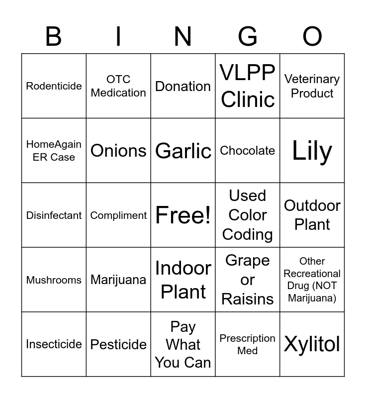 This bingo card has a free space and 24 words: Marijuana, Pesticide, Garlic, Insecticide, Veterinary Product, Rodenticide, HomeAgain ER Case, OTC Medication, Used Color Coding, Indoor Plant, Chocolate, Disinfectant, Grape or Raisins, Other Recreational Drug (NOT Marijuana), Onions, Prescription Med, Outdoor Plant, Donation, Lily, Compliment, Xylitol, Mushrooms, VLPP Clinic and Pay What You Can.