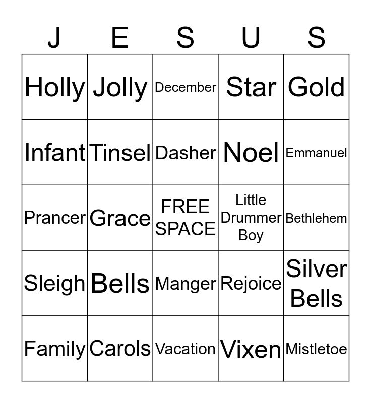 This bingo card has a free space and 24 words: Bells, Carols, Dasher, Family, Gold, Holly, Infant, Jolly, Little Drummer Boy, Manger, Noel, Prancer, Rejoice, Silver Bells, Tinsel, Vixen, Bethlehem, December, Emmanuel, Grace, Mistletoe, Sleigh, Star and Vacation.