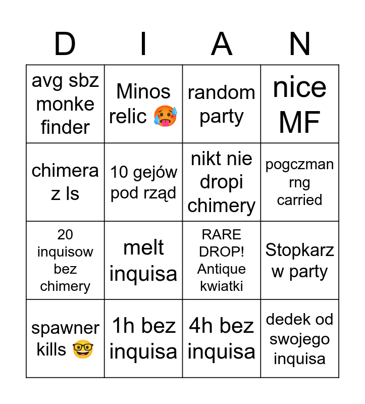 This bingo card has 16 words: 1h bez inquisa, Stopkarz w party, random party, avg sbz monke finder, 20 inquisow bez chimery, Minos relic 🥵, RARE DROP! Antique kwiatki, 4h bez inquisa, chimera z ls, 10 gejów pod rząd, spawner kills 🤓, nice MF, melt inquisa, pogczman rng carried, nikt nie dropi chimery and dedek od swojego inquisa.