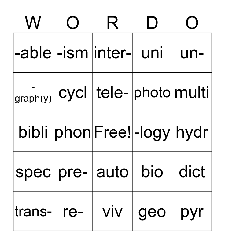 This bingo card has a free space and 24 words: pre-, re-, tele-, trans-, un-, -able, -graph(y), -ism, -logy, auto, photo, bibli, bio, dict, cycl, geo, hydr, inter-, multi, phon, pyr, spec, uni and viv.