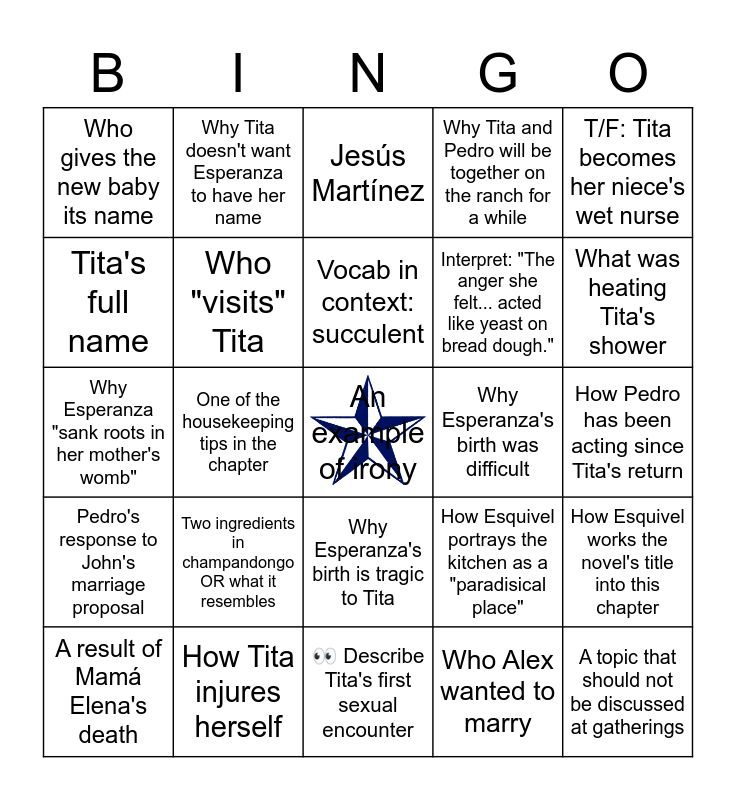 This bingo card has a free space and 24 words: Two ingredients in champandongo OR what it resembles, How Tita injures herself, Vocab in context: succulent, A result of Mamá Elena's death, T/F: Tita becomes her niece's wet nurse, Who gives the new baby its name, Tita's full name, Why Tita doesn't want Esperanza to have her name, Why Esperanza's birth was difficult, Why Esperanza's birth is tragic to Tita, Interpret: "The anger she felt... acted like yeast on bread dough.", Why Esperanza "sank roots in her mother's womb", How Esquivel portrays the kitchen as a "paradisical place", How Esquivel works the novel's title into this chapter, Who "visits" Tita, Who Alex wanted to marry, How Pedro has been acting since Tita's return, Jesús Martínez, What was heating Tita's shower, One of the housekeeping tips in the chapter, A topic that should not be discussed at gatherings, Pedro's response to John's marriage proposal, Why Tita and Pedro will be together on the ranch for a while and 👀 Describe Tita's first sexual encounter.