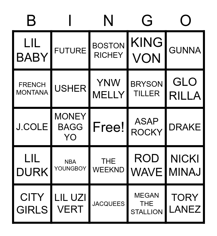 This bingo card has a free space and 24 words: NBA YOUNGBOY, LIL UZI VERT, YNW MELLY, CITY GIRLS, GUNNA, LIL BABY, FRENCH MONTANA, FUTURE, ASAP ROCKY, THE WEEKND, BRYSON TILLER, J.COLE, ROD WAVE, NICKI MINAJ, USHER, MEGAN THE STALLION, DRAKE, BOSTON RICHEY, GLO RILLA, MONEY BAGG YO, TORY LANEZ, LIL DURK, KING VON and JACQUEES.