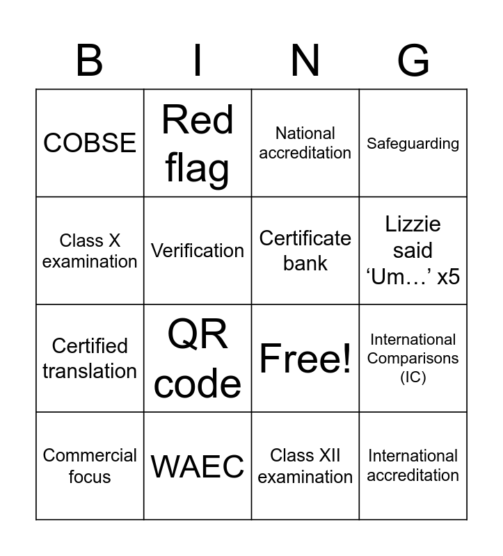 This bingo card has 19 words: Free!, Diploma mill, National accreditation, International accreditation, International Comparisons (IC), Class X examination, Class XII examination, COBSE, Red flag, Certified translation, QR code, Verification, Certificate bank, WAEC, Commercial focus, Digital footprint, Safeguarding, Lizzie said ‘Um…’ x5 and Raya said ‘So…’ x5.