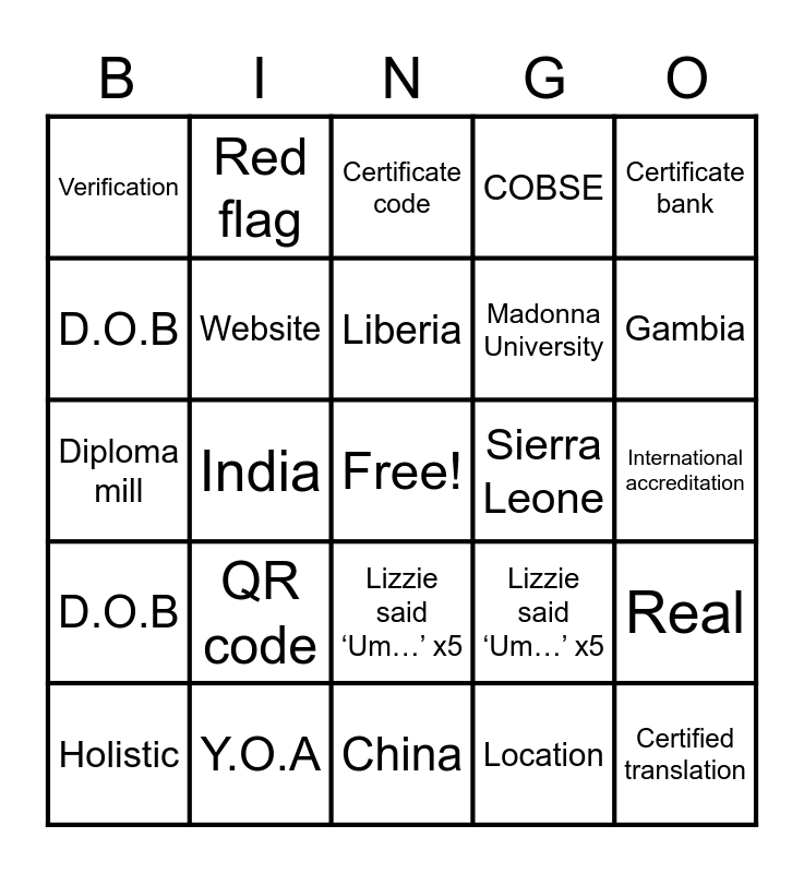 This bingo card has a free space and 118 words: Diploma mill, National accreditation, International accreditation, International Comparisons (IC), Class X examination, Class XII examination, COBSE, Red flag, Certified translation, QR code, Verification, Certificate bank, WAEC, Commercial focus, Digital footprint, Safeguarding, Lizzie said ‘Um…’ x5, Raya said ‘So…’ x5, Madonna University, Corllins University, Holistic, Certificate code, Comparability, Institution listing, Location, D.O.B, Y.O.A, Nigeria, Ghana, Sierra Leone, Gambia, Liberia, India, Punjab, China, Exam Board, Fake, Fraudulent, Real, Genuine, Unaccredited, Quality assurance, Pakistan, Definition, Certificate, Website, Location, D.O.B, Y.O.A, Nigeria, Ghana, Sierra Leone, Gambia, Liberia, India, Punjab, China, Exam Board, Fake, Fraudulent, Real, Genuine, Unaccredited, Quality assurance, Pakistan, Definition, Certificate, Website, Diploma mill, National accreditation, International accreditation, International Comparisons (IC), Class X examination, Class XII examination, COBSE, Red flag, Certified translation, QR code, Verification, Certificate bank, WAEC, Commercial focus, Digital footprint, Safeguarding, Lizzie said ‘Um…’ x5, Raya said ‘So…’ x5, Madonna University, Corllins University, Holistic, Certificate code, Comparability, Institution listing, Certified translation, QR code, Verification, Certificate bank, WAEC, Commercial focus, Digital footprint, Safeguarding, Lizzie said ‘Um…’ x5, Raya said ‘So…’ x5, Madonna University, Corllins University, Ghana, Sierra Leone, Gambia, Liberia, India, Punjab, China, Exam Board, Fake, Fraudulent, Real, Genuine, Unaccredited and Quality assurance.