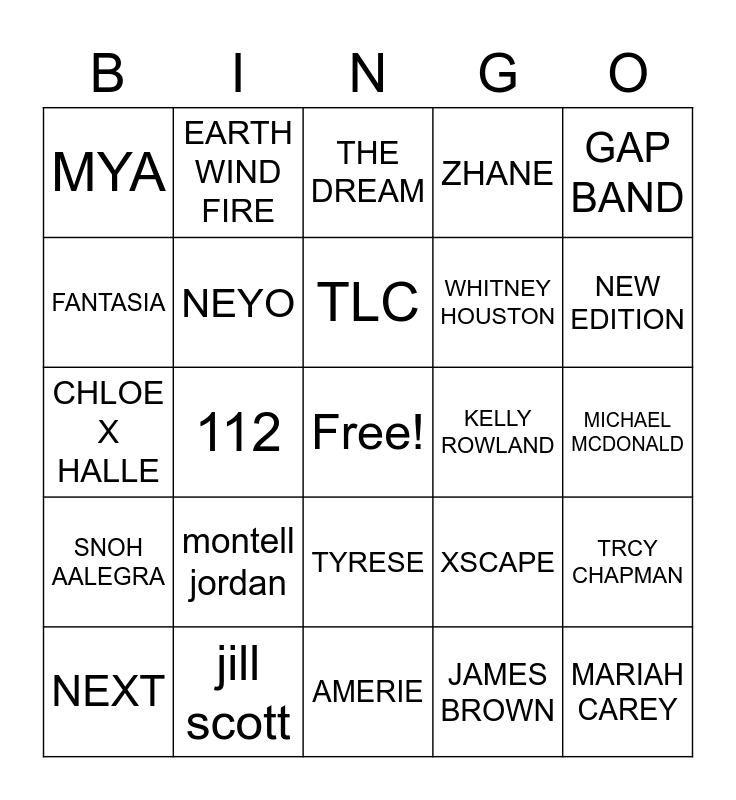 This bingo card has a free space and 24 words: montell jordan, jill scott, TLC, NEXT, GAP BAND, MYA, FANTASIA, EARTH WIND FIRE, KELLY ROWLAND, TYRESE, WHITNEY HOUSTON, CHLOE X HALLE, XSCAPE, TRCY CHAPMAN, NEYO, JAMES BROWN, MICHAEL MCDONALD, THE DREAM, NEW EDITION, 112, MARIAH CAREY, SNOH AALEGRA, ZHANE and AMERIE.