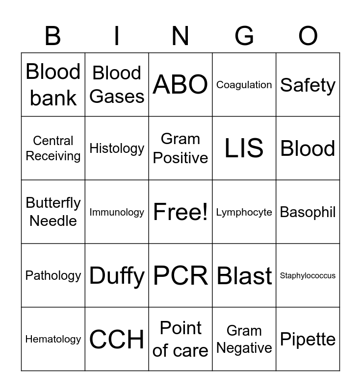 This bingo card has a free space and 55 words: Chemistry, Hematology, Microbiology, Blood bank, Point of care, Cytology, Histology, Sunquest, LIS, Epic, Coagulation, Glucose, Beckman Coulter, Sysmex, Lumena, EPOC, Safety, Immunology, Serology, Pipette, Lymphocyte, Neutrophil, Blast, ABO, Urinalysis, Gram Positive, Gram Negative, Eosinophil, Basophil, Staphylococcus, Streptococcus, Covid-19, Lactobacillus, Phlebotomy, Central Receiving, Butterfly Needle, Lab, Pathology, Troponin, DxI, Blood Gases, Kell, Rh positive, Rh negative, Duffy, CCH, Microscope, Microtome, Biopsy, Blood, Urine, Cell, Molecular Biology, PCR and Blood Culture.