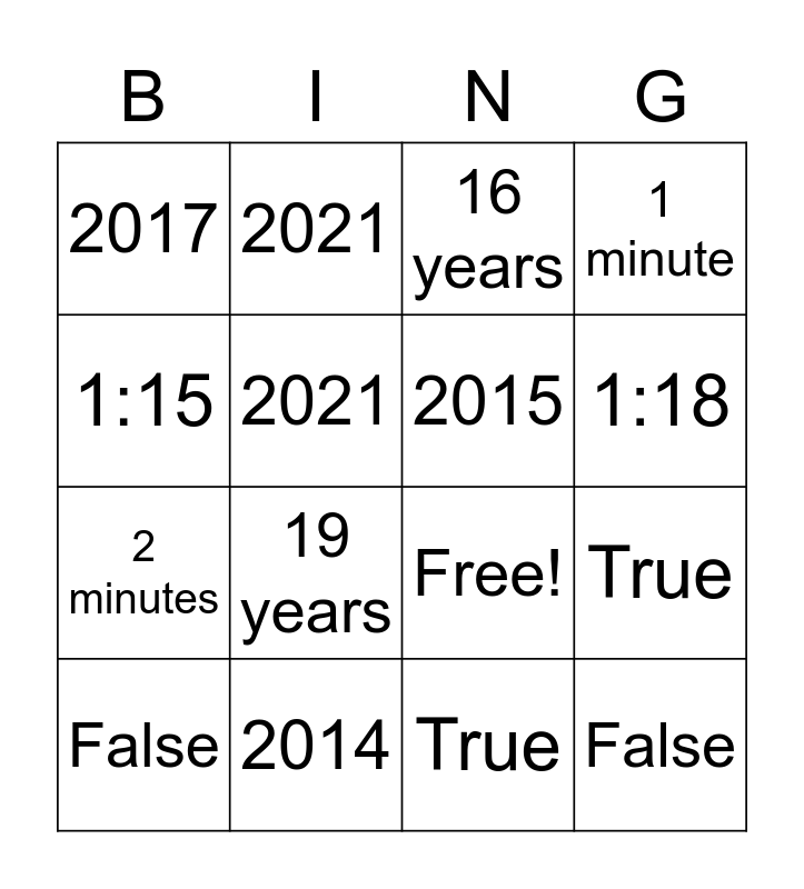 This bingo card has 16 words: 2014, True, 16 years, 2017, 2 minutes, 2021, Free!, True, 1:15, 2021, False, 1 minute, 19 years, 1:18, 2015 and False.