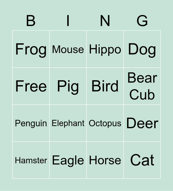 This bingo card has 36 words: Alligator, Anteater, Bear, Bird, Bull, Cat, Bear Cub, Chicken, Free, Cow, Deer, Dog, Duck, Eagle, Elephant, Frog, Goat, Gorilla, Hamster, Hippo, Horse, Koala, Kangaroo, Lion, Monkey, Mouse, Octopus, Ostrich, Penguin, Pig, Rabbit, Rhino, Sheep, Squirrel, Tiger and Wolf.