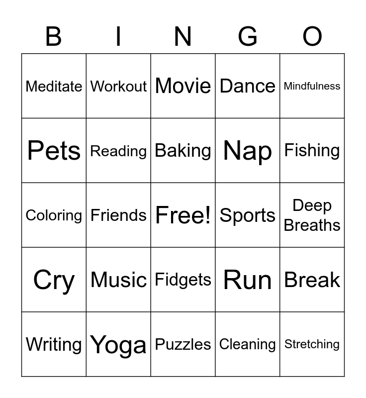 This bingo card has a free space and 27 words: Run, Outdoors, Nap, Puzzles, Pets, Movie, Workout, Cry, Sports, Break, Coloring, Dance, Writing, Yoga, Fishing, Paint, Reading, Baking, Music, Meditate, Deep Breaths, Cleaning, Friends, Stretching, Fidgets, Mindfulness and Distractions.