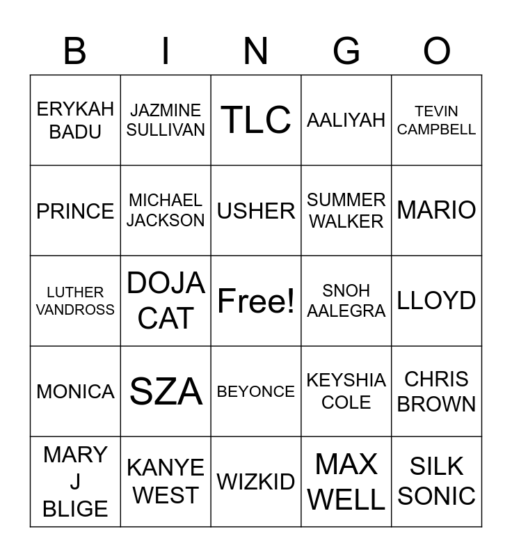 This bingo card has a free space and 24 words: SZA, KANYE WEST, USHER, MARY J BLIGE, TEVIN CAMPBELL, ERYKAH BADU, PRINCE, JAZMINE SULLIVAN, SNOH AALEGRA, BEYONCE, SUMMER WALKER, LUTHER VANDROSS, KEYSHIA COLE, CHRIS BROWN, MICHAEL JACKSON, MAX WELL, LLOYD, TLC, MARIO, DOJA CAT, SILK SONIC, MONICA, AALIYAH and WIZKID.