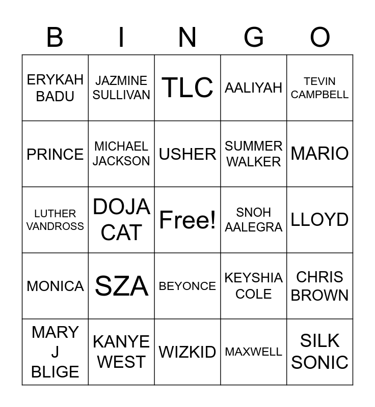 This bingo card has a free space and 24 words: SZA, KANYE WEST, USHER, MARY J BLIGE, TEVIN CAMPBELL, ERYKAH BADU, PRINCE, JAZMINE SULLIVAN, SNOH AALEGRA, BEYONCE, SUMMER WALKER, LUTHER VANDROSS, KEYSHIA COLE, CHRIS BROWN, MICHAEL JACKSON, MAXWELL, LLOYD, TLC, MARIO, DOJA CAT, SILK SONIC, MONICA, AALIYAH and WIZKID.