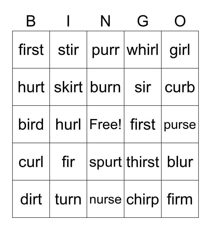 This bingo card has a free space and 24 words: fir, turn, burn, dirt, girl, first, hurt, stir, first, spurt, sir, bird, thirst, blur, skirt, chirp, purse, purr, curb, hurl, firm, curl, whirl and nurse.