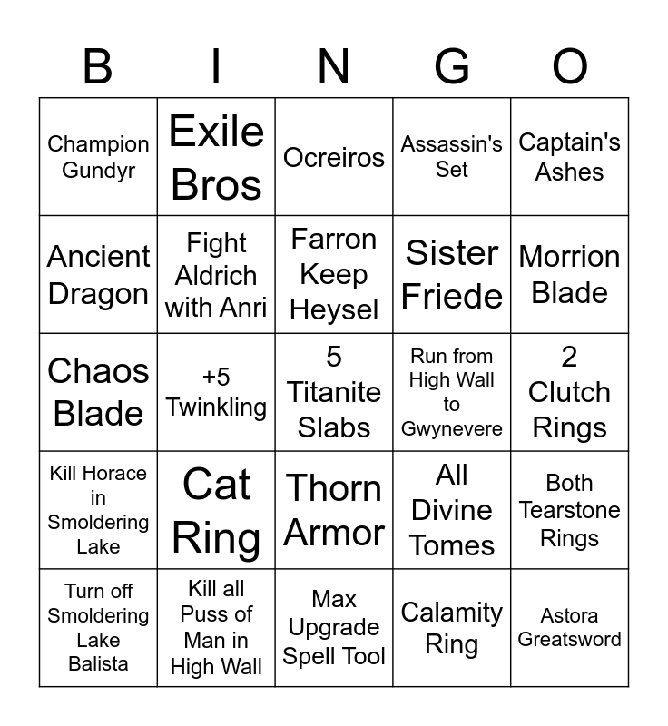 This bingo card has 85 words: Old Demon King, Nameless King, Ocreiros, Seigward Quest, Kill all Giants in Cathedral, Befriend Giant, Bone Greyrat, Knight Slayer Tsorig, Sandworm, All Estus, All Bone Shards, Darksign with 50,000, Fight Aldrich with Anri, Run from High Wall to Gwynevere, 25 Luck, Champion Gundyr, Turn off Smoldering Lake Balista, Ancient Dragon, All Coals, All Scrolls, Midir, Sister Friede, 5 Titanite Slabs, +10 Weapon, +5 Twinkling, +5 Scale, Fire Keeper Set, Demon Prince, Champion's Gravetender, Change appearance with Rosaria, Cat Ring, Kill Andre, Kill Handmaiden, Chaos Blade, Astora Greatsword, Kill a Boss with a Whip, Max Upgrade Spell Tool, High Wall Darkwraith, Kill Horace in Smoldering Lake, Morrion Blade, Go Hollow, Greatwood, Onyx Blade, Eleanora, Smough's Hammer, Lvl 70, Black Bow, Kill a Boss with a Bow, Court Sorcery Staff, 2 Stat Boosting Rings, Exile Bros, Farron Keep Heysel, Brass Set, Archdeacon Set, Sunlight Sword, Kill all Mimics in Irithyll Dungeon, Kill all Puss of Man in High Wall, Assassin's Set, Crown of Dusk, Hawk Ring, Kill all Big Crabs, Hornet Ring, Stray Demon, Both Fire Demons, FAP Ring, Captain's Ashes, Free Karla, Both Tearstone Rings, Break a Weapon, Gank Squad, Kill Havel, Trade 5 times with Pickle-Pee and Pump-a-Rum, Ledo's Great Hammer, Yorshka's Chime, Drang Bros, Thorn Armor, Calamity Ring, Both Aldrich Rings, Both Lloyd Rings, Both Pontiff Rings, 2 Clutch Rings, Quakestone Hammer, Ringed City Dragonslayer Armor, All Divine Tomes and All Spell Scrolls.