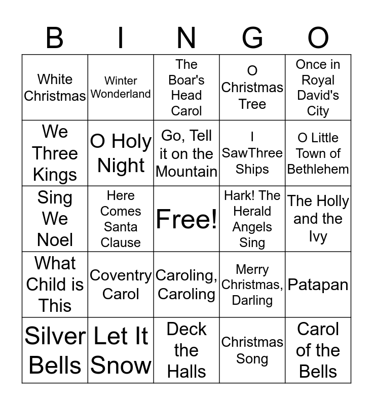 This bingo card has a free space and 50 words: Jingle Bells, Carol of the Bells, Angels We Have Heard on High, Deck the Halls, Coventry Carol, The First Noel, Winter Wonderland, The Friendly Beasts, We Three Kings, We Wish You a Merry Christmas, O Holy Night, O Christmas Tree, Patapan, Merry Christmas, Darling, March of the Toys, Twas the Night Before Christmas, Go, Tell it on the Mountain, Hark! The Herald Angels Sing, I'll Be Home for Christmas, Once in Royal David's City, Here Comes Santa Clause, Christmas Song, White Christmas, I SawThree Ships, God Rest Ye Merry Gentlemen, O Come, Little Children, O Little Town of Bethlehem, I Wonder as I Wander, The Boar's Head Carol, Caroling, Caroling, Toyland, Silent Night, The Snow Lay on the Ground, Sleigh Ride, Let It Snow, Auld Lang Syne, Birthday of a King, Good King Wenceslas, Hawaiian Christmas Song, The Holly and the Ivy, Jolly Old St. Nicholas, Joy to the World, Rudolph, Frosty, Silver Bells, Sing We Noel, The Star Carol, Twelve Days of Christmas, What Child is This and Up On the Housetop.