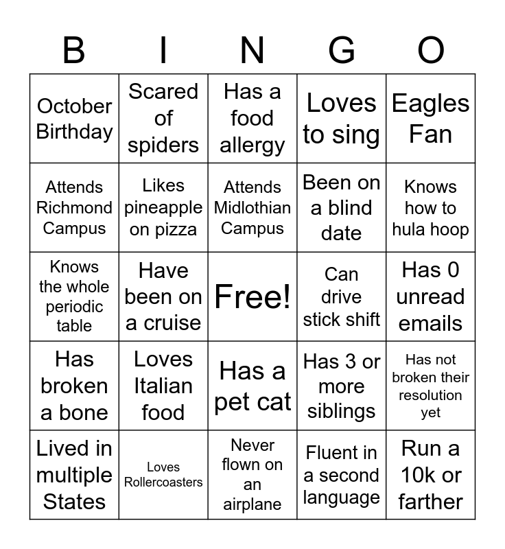 This bingo card has a free space and 24 words: Lived in multiple States, Loves Italian food, Attends Midlothian Campus, Fluent in a second language, Eagles Fan, October Birthday, Scared of spiders, Has a food allergy, Can drive stick shift, Has 0 unread emails, Knows the whole periodic table, Likes pineapple on pizza, Has 3 or more siblings, Has not broken their resolution yet, Attends Richmond Campus, Loves Rollercoasters, Never flown on an airplane, Loves to sing, Knows how to hula hoop, Has broken a bone, Have been on a cruise, Has a pet cat, Been on a blind date and Run a 10k or farther.