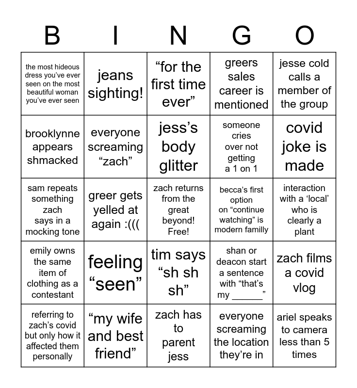 This bingo card has a free space and 24 words: feeling “seen”, “my wife and best friend”, jess’s body glitter, referring to zach’s covid but only how it affected them personally, jesse cold calls a member of the group, the most hideous dress you’ve ever seen on the most beautiful woman you’ve ever seen, brooklynne appears shmacked, jeans sighting!, becca’s first option on “continue watching” is modern familly, tim says “sh sh sh”, someone cries over not getting a 1 on 1, sam repeats something zach says in a mocking tone, shan or deacon start a sentence with “that’s my ______”, zach films a covid vlog, everyone screaming “zach”, everyone screaming the location they’re in, interaction with a ‘local’ who is clearly a plant, “for the first time ever”, covid joke is made, greer gets yelled at again :(((, ariel speaks to camera less than 5 times, emily owns the same item of clothing as a contestant, greers sales career is mentioned and zach has to parent jess.