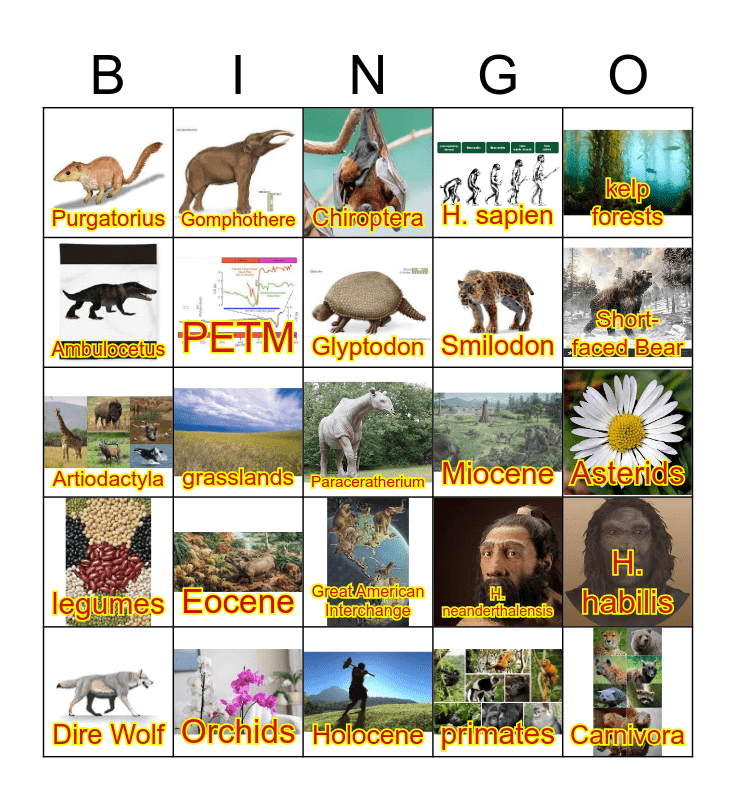This bingo card has 46 images and 46 words: Paleocene, Paraceratherium, Pleistocene, Holocene, Eocene, Borophagus, Gomphothere, Eohippus, Ambulocetus, Basilosaurus, PETM, H. sapien, H. habilis, H. neanderthalensis, H. erectus, Columbian Mammoth, Glyptodon, Miocene, Oligocene, kelp forests, grasslands, primates, Purgatorius, Smilodon, Megalodon, Short-faced Bear, Dire Wolf, Decidious Forest, Great American Interchange, legumes, A. Afarensis, Fire, Stone Tools, Loxolophus, Poaceae, Orchids, Asterids, Hymnoptera, Rosids, Primate, Carnivora, Chiroptera, Artiodactyla, Perrisodactyla, Rodenta and Ice Sheet.