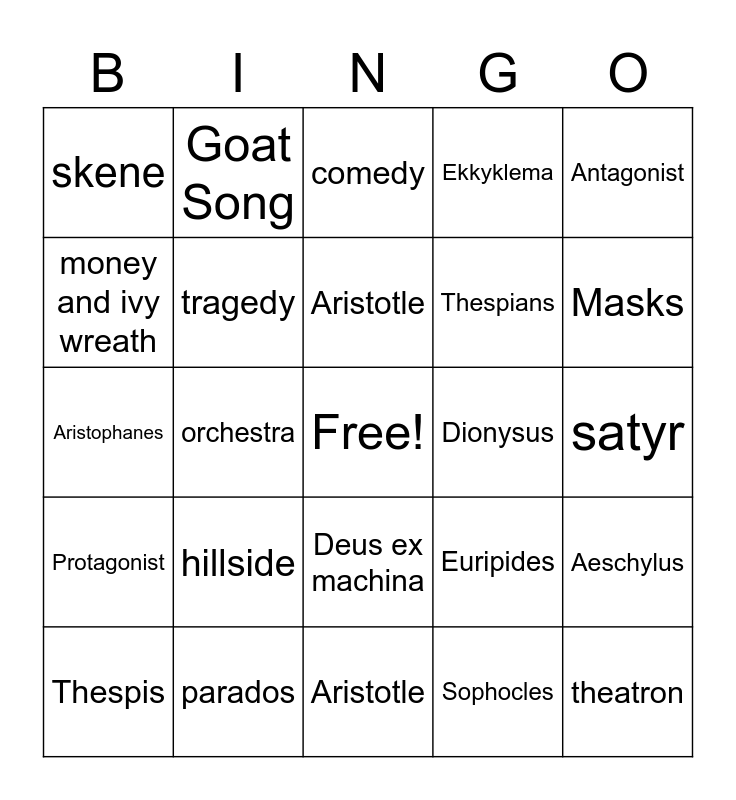 This bingo card has a free space and 29 words: Thespis, paraskene, orchestra, chorus, skene, comedy, tragedy, hillside, Dionysus, parados, satyr, theatron, Aristotle, Sophocles, Masks, Male Actors, Deus ex machina, Protagonist, Antagonist, Aristophanes, Euripides, Religious festivals, Thespians, money and ivy wreath, Ekkyklema, Goat Song, Aeschylus, Aristotle and Athens.