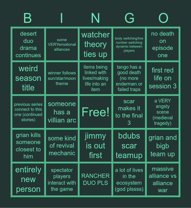 This bingo card has a free space and 24 words: some kind of revival mechanic, spectator players interact with the game, items being linked with lives/making life into an item, entirely new person, no death on episode one, desert duo drama continues, weird season title, some VERYemotional alliances, scar makes it to the final 3, jimmy is out first, tango has a good death (no more endermen or failed traps, previous series connect to this one (continued stories), bdubs scar teamup, grian and bigb team up, winner follows sun/star/moon theme, a lot of lives in the ecosystem (god plssss), a VERY angsty scene (medieval tragedy), watcher theory ties up, first red life on session 3, someone has a villian arc, massive alliance vs alliance war, grian kills someone closest to him, body switching/live number switching dynamic between players and RANCHER DUO PLS.