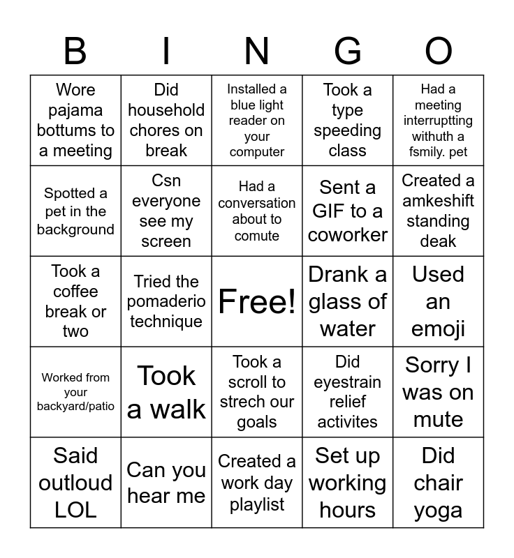 This bingo card has a free space and 24 words: Took a walk, Can you hear me, Had a conversation about to comute, Said outloud LOL, Had a meeting interruptting withuth a fsmily. pet, Wore pajama bottums to a meeting, Spotted a pet in the background, Did household chores on break, Drank a glass of water, Took a scroll to strech our goals, Sent a GIF to a coworker, Took a coffee break or two, Did eyestrain relief activites, Sorry I was on mute, Csn everyone see my screen, Set up working hours, Used an emoji, Installed a blue light reader on your computer, Created a amkeshift standing deak, Tried the pomaderio technique, Did chair yoga, Worked from your backyard/patio, Took a type speeding class and Created a work day playlist.