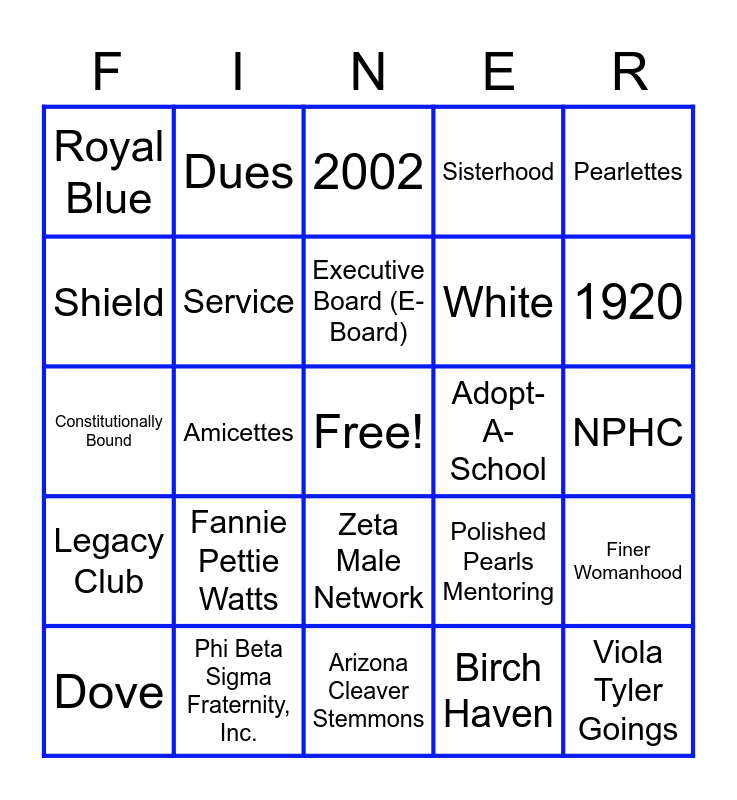 This bingo card has a free space and 47 words: Myrtle Tyler Faithful, Viola Tyler Goings, Pearl Anna Neal, Arizona Cleaver Stemmons, Fannie Pettie Watts, Eldercare, Dues, Fees, Shield, Scholarship, Service, Sisterhood, Finer Womanhood, Polished Pearls Mentoring, Howard University, Anti/Non-Hazing, Executive Board (E-Board), Adopt-A-School, Archonettes, Pearlettes, Amicettes, Birch Haven, Royal Blue, White, Z-HOPETM, 1920, Dove, Get Engaged, Zeta Male Network, Legacy Club, MIP, 5 Pearls, ZOL, Helping Mamas, Archon, Phi Beta Sigma Fraternity, Inc., NPHC, Divine 9, Risk Management, Pearls of Excellence, Beyond the Spectrum, 2002, Constitutionally Bound, Embrace the Swell, Southeastern Region, Zeta Phi Beta Sorority, Inc. and Life Members.