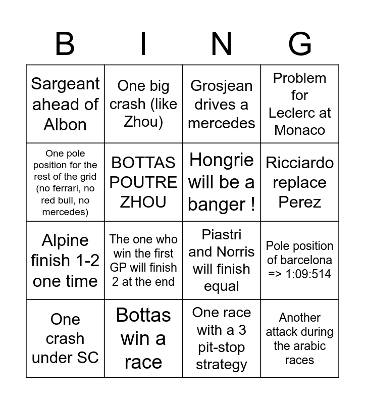 This bingo card has 16 words: Bottas win a race, Pole position of barcelona => 1:09:514, Grosjean drives a mercedes, Sargeant ahead of Albon, Alpine finish 1-2 one time, One big crash (like Zhou), Piastri and Norris will finish equal, One race with a 3 pit-stop strategy, One pole position for the rest of the grid (no ferrari, no red bull, no mercedes), BOTTAS POUTRE ZHOU, One crash under SC, Problem for Leclerc at Monaco, The one who win the first GP will finish 2 at the end, Ricciardo replace Perez, Hongrie will be a banger ! and Another attack during the arabic races.
