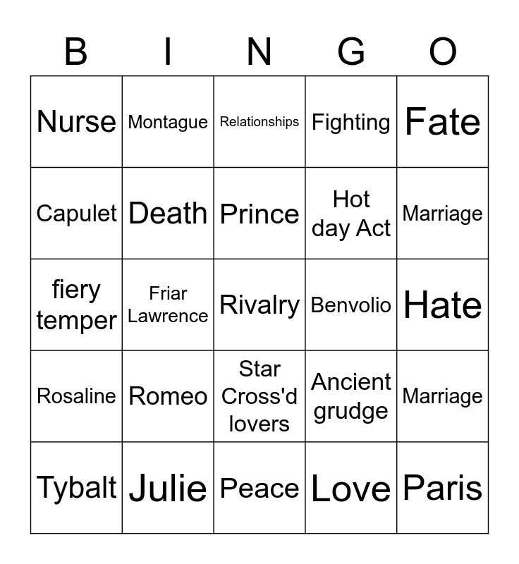 This bingo card has a free space and 24 words: Romeo, Julie, Prince, Tybalt, Fate, Nurse, Capulet, Montague, Benvolio, Star Cross'd lovers, Hot day Act, fiery temper, Ancient grudge, Marriage, Death, Love, Hate, Relationships, Marriage, Friar Lawrence, Paris, Rosaline, Fighting and Peace.