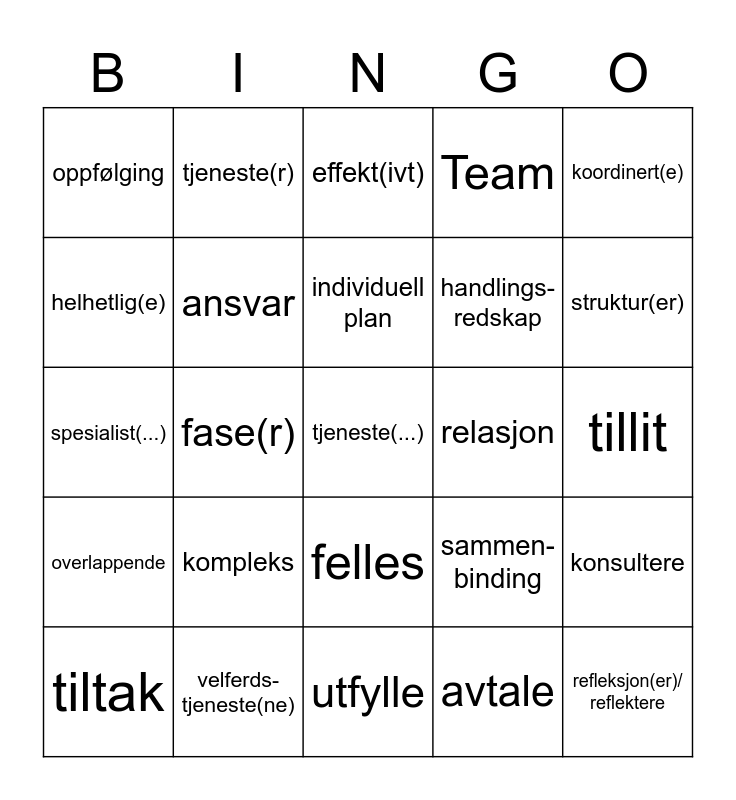 This bingo card has a free space and 24 words: kompleks, velferds-tjeneste(ne), individuell plan, tiltak, koordinert(e), oppfølging, helhetlig(e), tjeneste(r), relasjon, felles, handlings-redskap, spesialist(...), sammen-binding, konsultere, ansvar, avtale, tillit, effekt(ivt), struktur(er), fase(r), refleksjon(er)/ reflektere, overlappende, Team and utfylle.