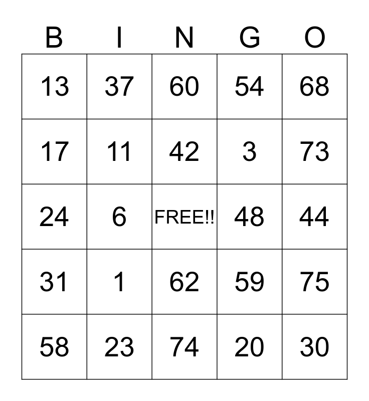 This bingo card has a free space and 24 words: 1, 23, 42, 58, 68, 13, 17, 37, 48, 62, 3, 24, 59, 75, 11, 20, 44, 60, 73, 6, 30, 31, 54 and 74.