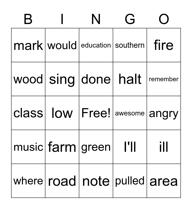 This bingo card has a free space and 24 words: farm, road, done, where, fire, mark, wood, would, awesome, green, halt, class, I'll, ill, sing, pulled, angry, education, remember, low, area, music, southern and note.