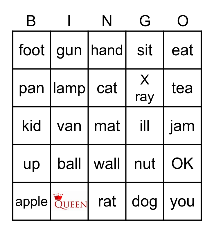 This bingo card has 1 images, a free space and 23 words: apple, ball, cat, dog, eat, foot, gun, hand, ill, jam, kid, lamp, nut, OK, pan, rat, sit, tea, up, van, wall, X ray and you.
