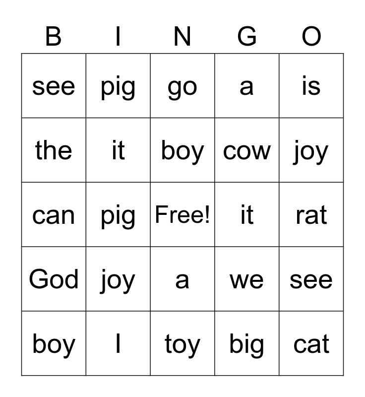 This bingo card has a free space and 37 words: God, Jesus, go, it, see, joy, boy, toy, is, big, pig, a, cat, rat, the, God, Jesus, go, a, it, see, joy, boy, toy, is, big, pig, a, cat, rat, the, I, can, me, we, cow and bee.