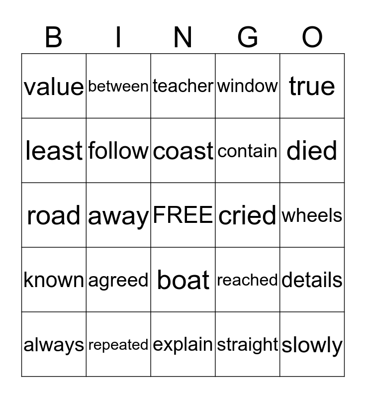 This bingo card has a free space and 24 words: agreed, repeated, coast, always, true, value, least, between, cried, boat, contain, road, reached, details, follow, straight, wheels, teacher, died, away, slowly, known, window and explain.