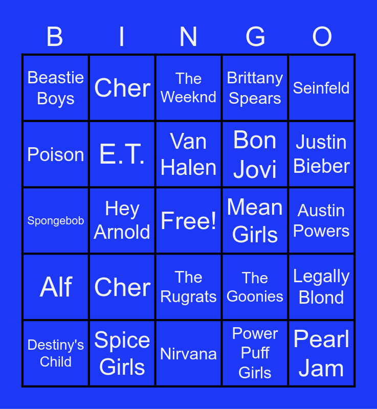 This bingo card has a free space and 34 words: The Breakfast Club, Power Puff Girls, Journey, Punky Brewster, Alf, E.T., Seinfeld, Destiny's Child, Cher, Backstreet Boys, Van Halen, The Weeknd, The Lion King, Twilight, Mean Girls, Justin Bieber, Spice Girls, Spongebob, Cher, The Goonies, The Rugrats, Salt-n-Pepa, Beastie Boys, Austin Powers, Nirvana, Pearl Jam, Brittany Spears, The Sandlot, Bon Jovi, Poison, Friends, Hey Arnold, Legally Blond and The Neverending Story.
