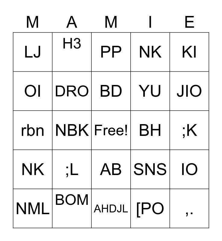 This bingo card has a free space and 40 words: eob, rbn, lop, DRO, BOM, AB, BD, ,, KI, NK, NBK, NK, ,., ;K, BH, ;L, HJ, LJ, N ,, PP, IO, [PO, YU, OI, ROhj, roGF, FH, JK, LD, DL, WUW, NML, SNIME, SNS, JIO, AHDJL, LKA, HL, H3 and H.