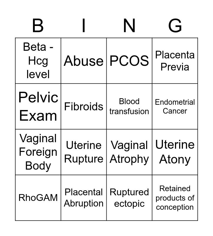 This bingo card has 16 words: Placental Abruption, Uterine Atony, PCOS, Beta - Hcg level, Vaginal Foreign Body, Abuse, Vaginal Atrophy, Ruptured ectopic, Pelvic Exam, Fibroids, RhoGAM, Placenta Previa, Uterine Rupture, Endometrial Cancer, Blood transfusion and Retained products of conception.