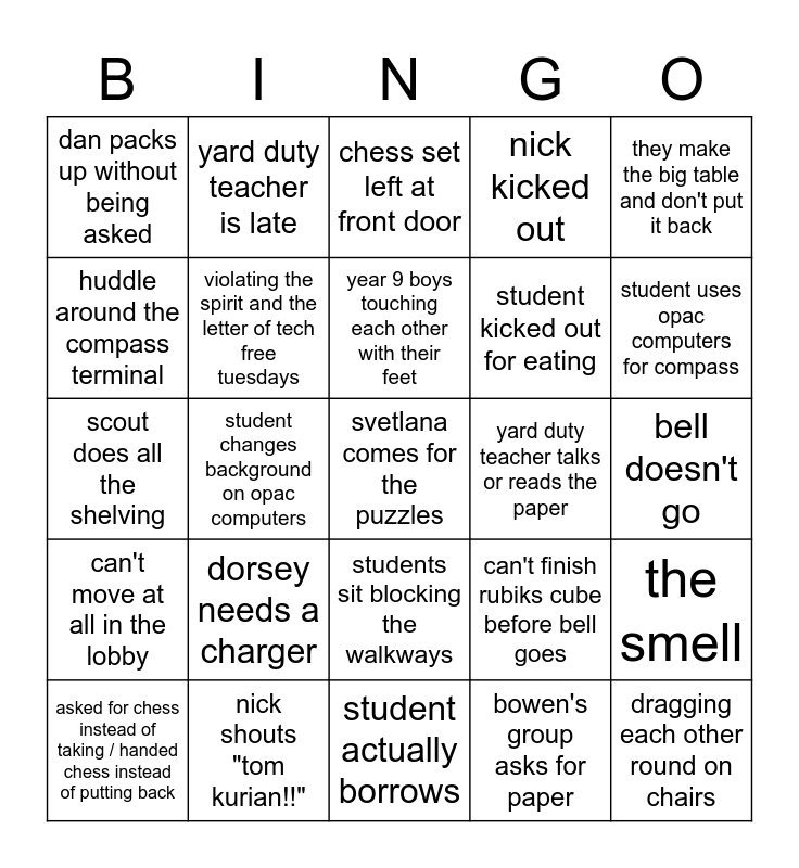 This bingo card has a free space and 24 words: dorsey needs a charger, nick shouts "tom kurian!!", year 9 boys touching each other with their feet, asked for chess instead of taking / handed chess instead of putting back, they make the big table and don't put it back, dan packs up without being asked, huddle around the compass terminal, yard duty teacher is late, yard duty teacher talks or reads the paper, students sit blocking the walkways, student kicked out for eating, scout does all the shelving, can't finish rubiks cube before bell goes, the smell, violating the spirit and the letter of tech free tuesdays, bowen's group asks for paper, bell doesn't go, chess set left at front door, student uses opac computers for compass, student changes background on opac computers, dragging each other round on chairs, can't move at all in the lobby, nick kicked out and student actually borrows.