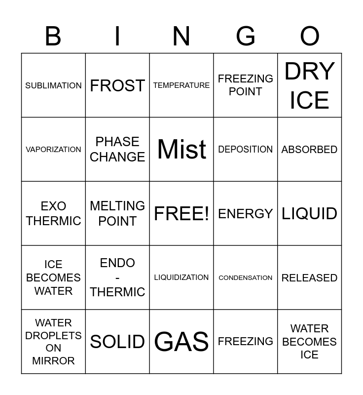 This bingo card has a free space and 24 words: ENDO -THERMIC, SOLID, Mist, WATER DROPLETS ON MIRROR, DRY ICE, SUBLIMATION, VAPORIZATION, FROST, ENERGY, LIQUIDIZATION, DEPOSITION, EXO THERMIC, CONDENSATION, RELEASED, PHASE CHANGE, FREEZING, LIQUID, TEMPERATURE, ABSORBED, MELTING POINT, WATER BECOMES ICE, ICE BECOMES WATER, FREEZING POINT and GAS.